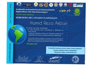«حمیدرضا اکبری، بهپاس فعالیتهای چشمگیر در راستای گسترش صلح و دوستی، شایسته دریافت این نشان شناخته شده است. ایشان با تلاشهای فرهنگی و ادبی خود، در افزایش آگاهی عمومی و تقویت گفتوگوی بین فرهنگی نقش بسزایی ایفا کرده و تأثیر مثبتی بر ارتباطات ملل مختلف گذاشته است.»