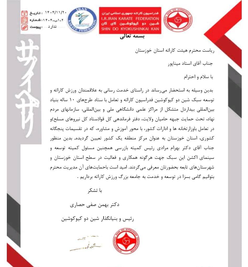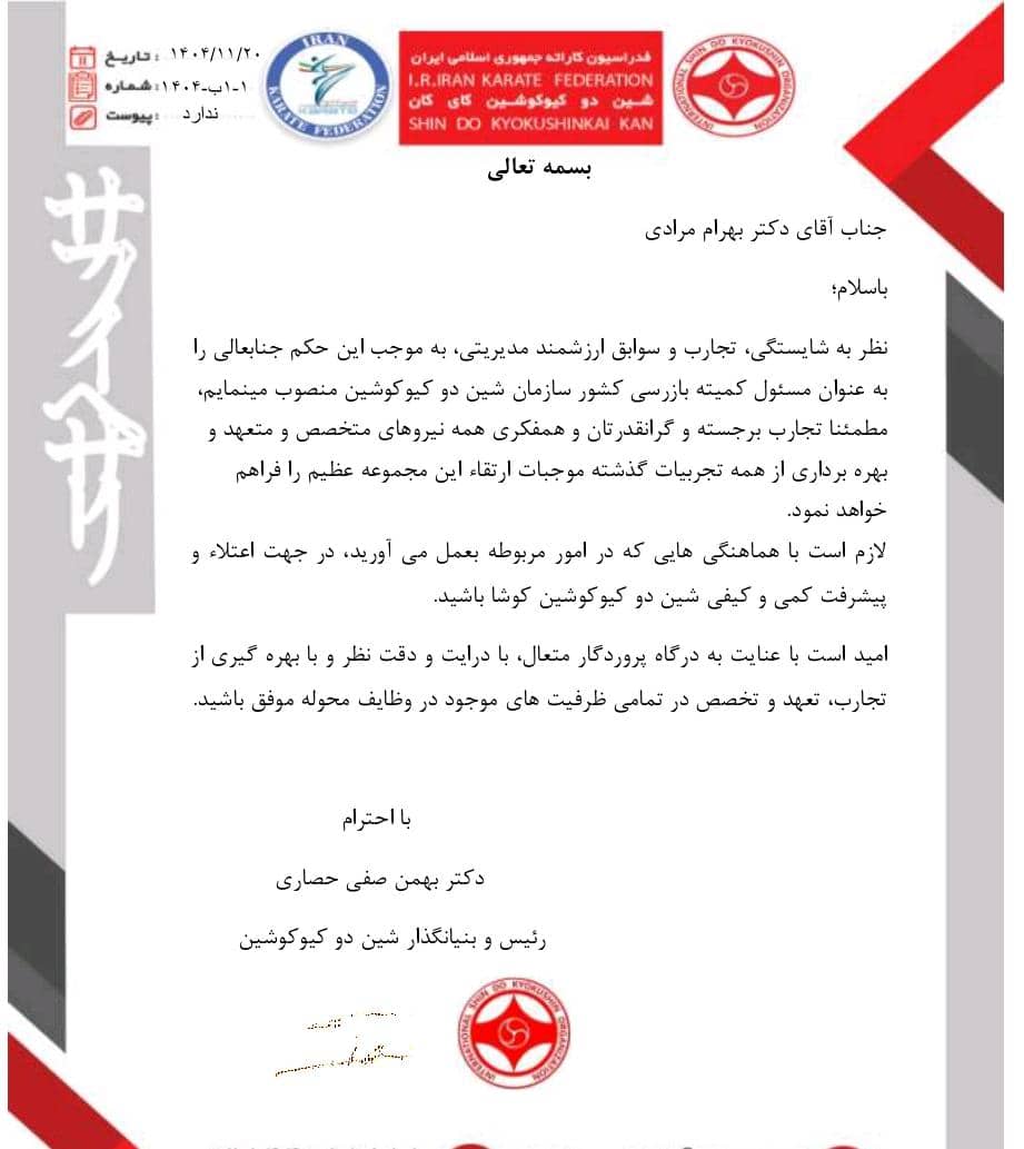 در حکم دوم، دکتر مرادی به عنوان مسئول کمیته بازرسی کشور سازمان شیندو کیوکوشین منصوب شد. در این حکم نیز بر هماهنگی با بخشهای ذیربط و اهتمام در مسیر اعتلای ساختاری و توسعهای این سبک تأکید شده است.